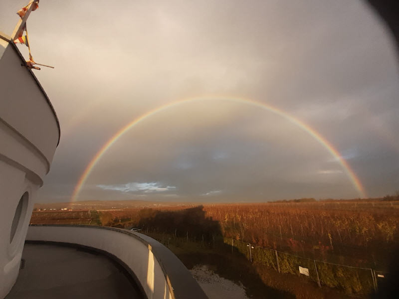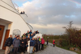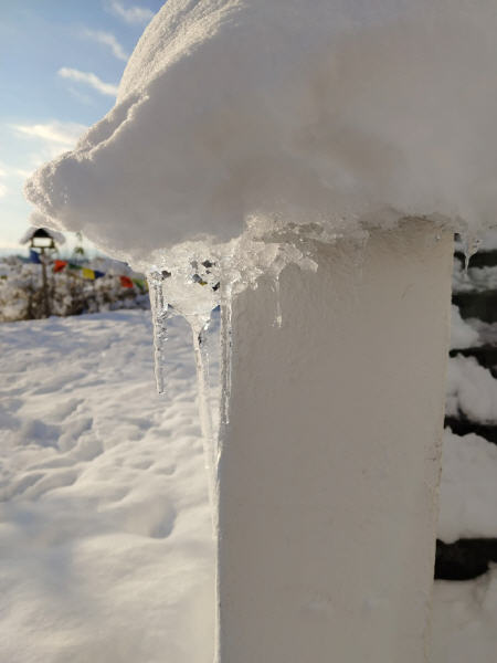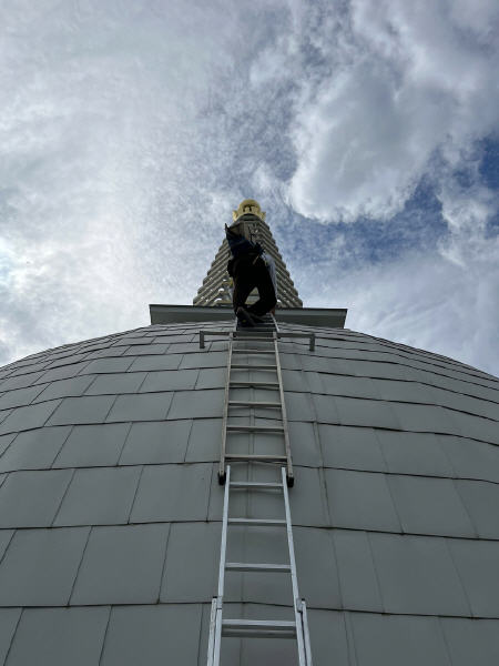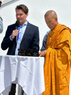 Am 06.05.2023 sind Sunim und unser Zimmermann Rudi auf den Stupa geklettert um die Reliquien in der Harmika aufzubewahren. Von S. H. Dalai Lama erhielt Sunim Tenzin Tharchin für den Stupa fünf Reliquien von Shakyamuni Buddha.