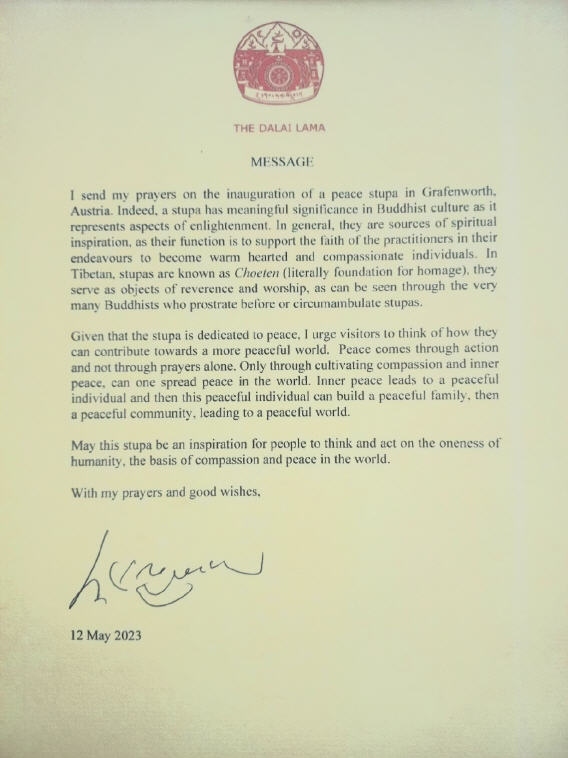 Ich sende meine Gebete für die Einweihung eines Friedensstupa in Grafenwörth, Österreich. Stupas haben in der buddhistischen Kultur eine wichtige Bedeutung, da sie Aspekte der Erleuchtung repräsentieren. Im Allgemeinen sind sie Quellen spiritueller Inspiration, da ihre Funktion darin besteht, den Glauben der Praktizierenden in ihrem Bestreben, warmherzige und mitfühlende Menschen zu werden, zu unterstützen. Im Tibetischen sind Stupas als Chörten (wörtlich: Fundament der Verehrung) bekannt und dienen als Objekte der Verehrung und Anbetung, wie man an den vielen Buddhisten sehen kann, die sich vor Stupas niederwerfen oder sie umwandeln.