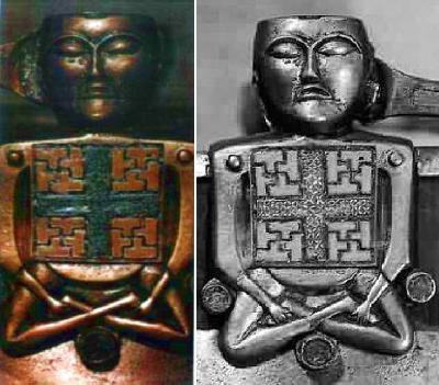Interessant ist hier, dass die 2 Abbildungen eine Swastika auf der Brust zeigen. Sie steht für die alte 4-Elemente-Theorie aus der alten westlichen mythologischen Welt, wie auch für die vier Himmelsrichtungen. Bemerkenswert ist dabei, das die Swastika-Formen der buddhistischen Swastika sehr gleichen.